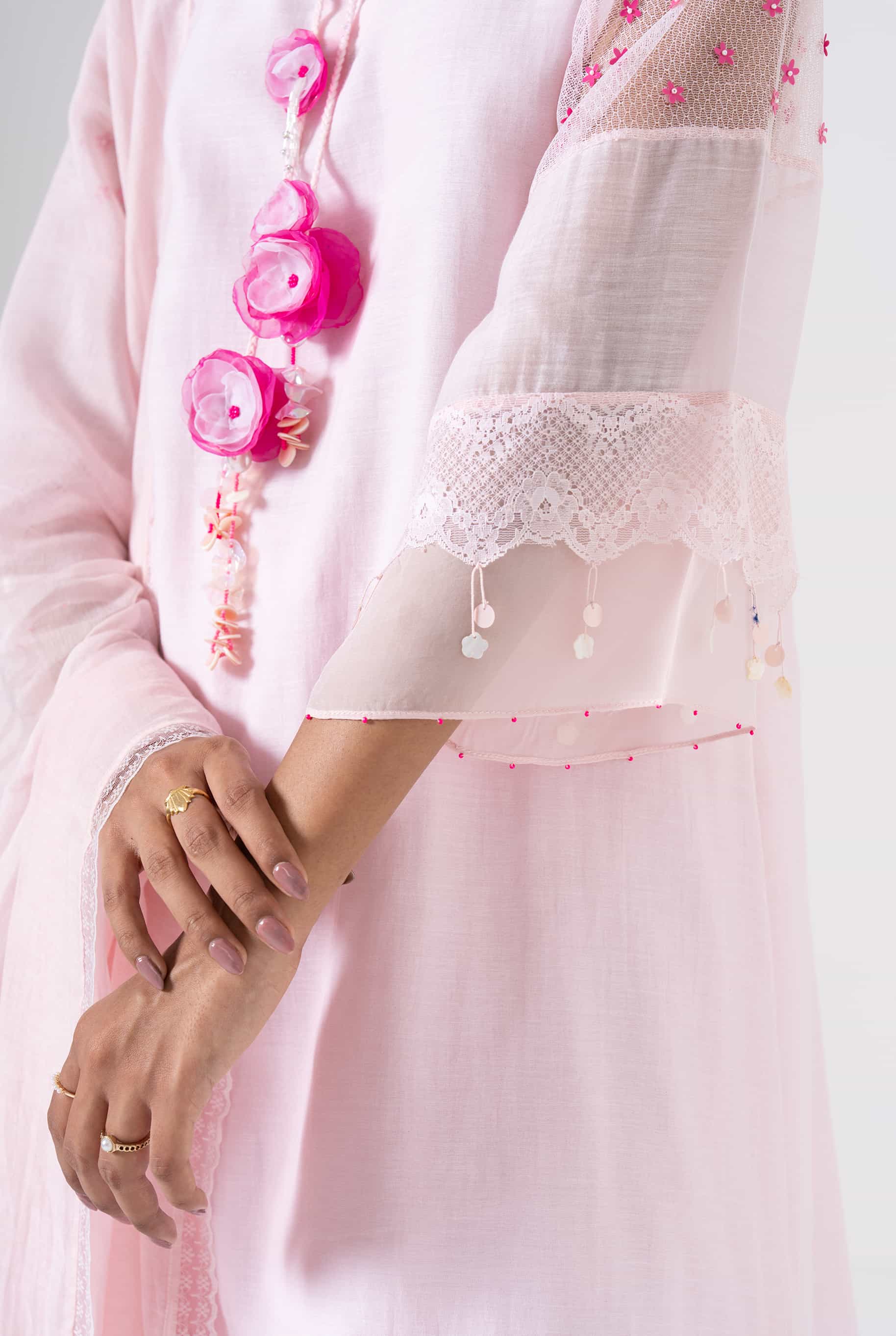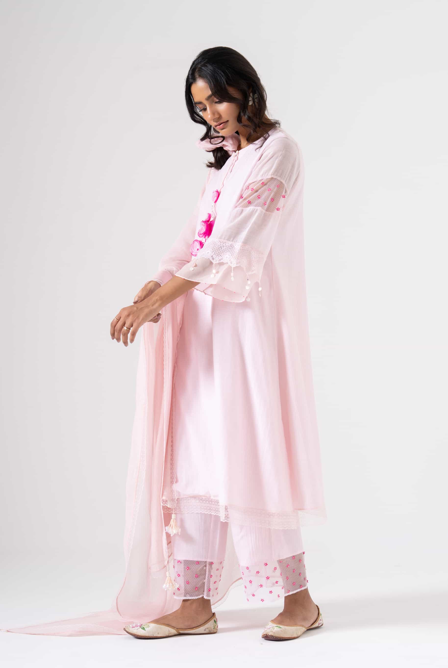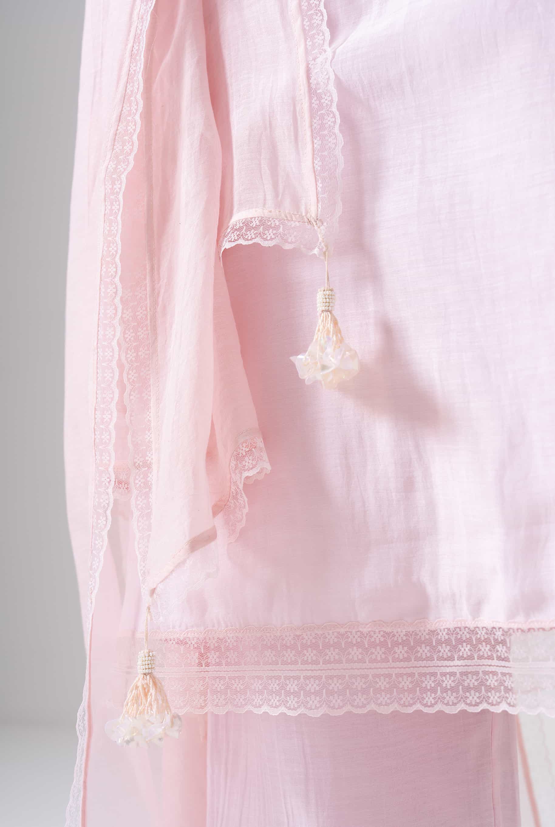 Soft, subtle, and thoughtfully detailed - Blush Bloom is a baby pink kurta set that brings quiet grace to everyday dressing. Crafted in airy Mul Chanderi, the kurta features delicate lace accents and handcrafted floral tassels, adding just the right hint of charm. Perfect for light festivities, brunches, or intimate celebrations.