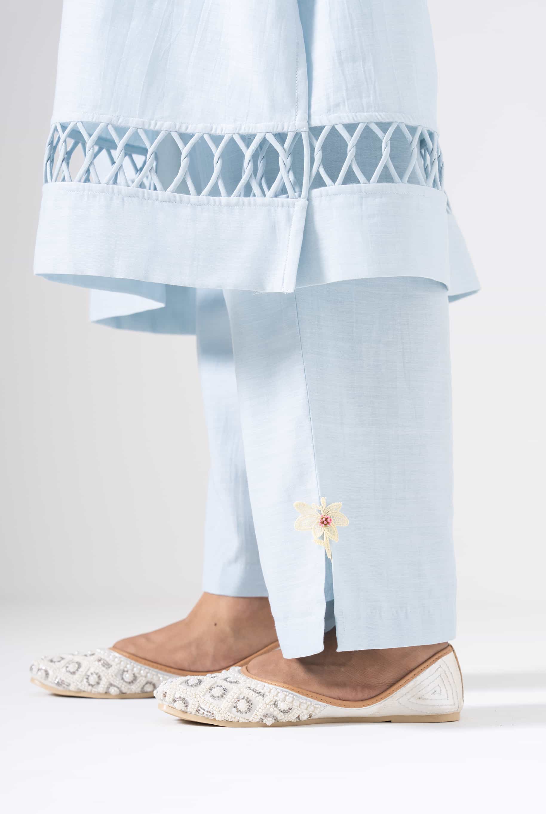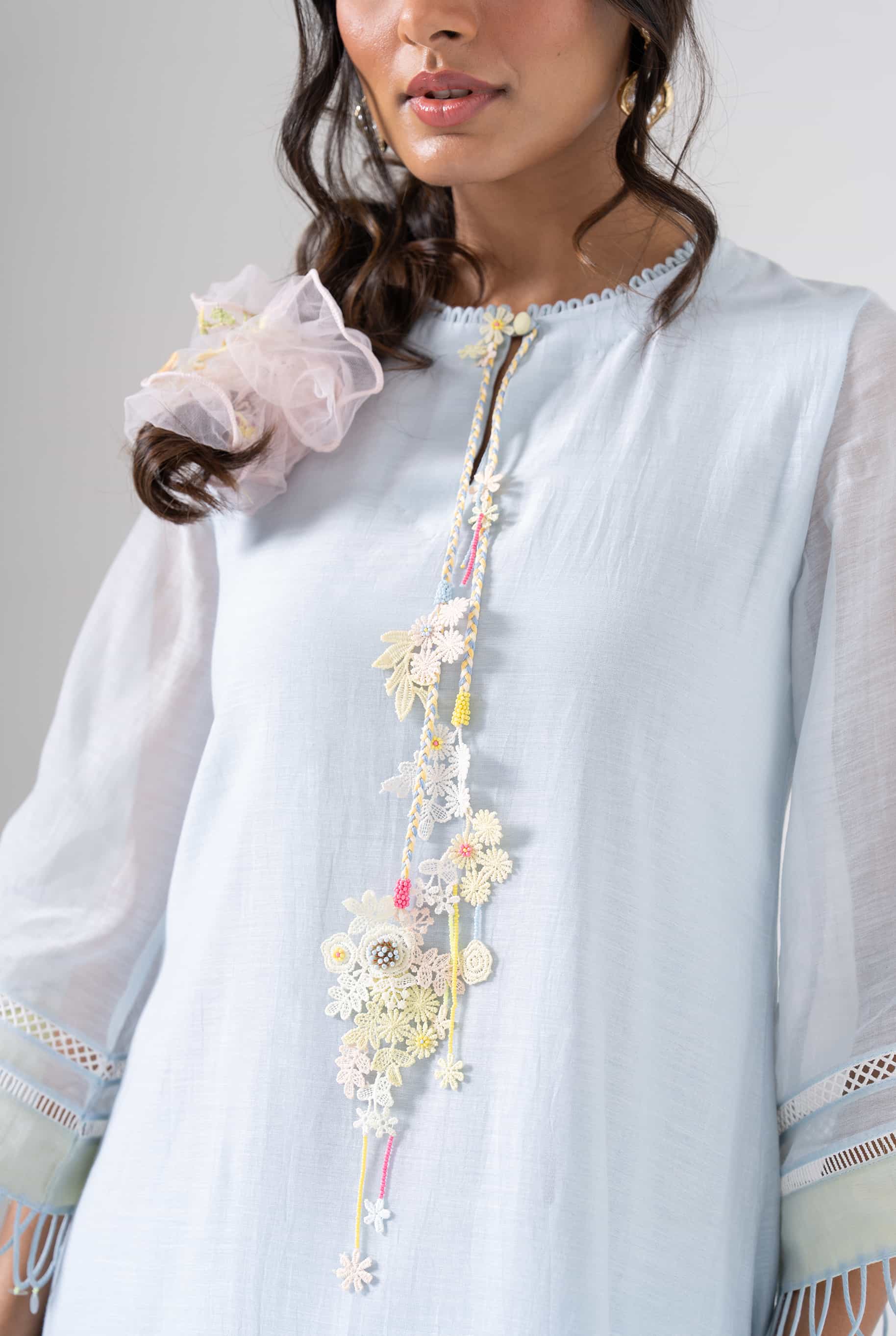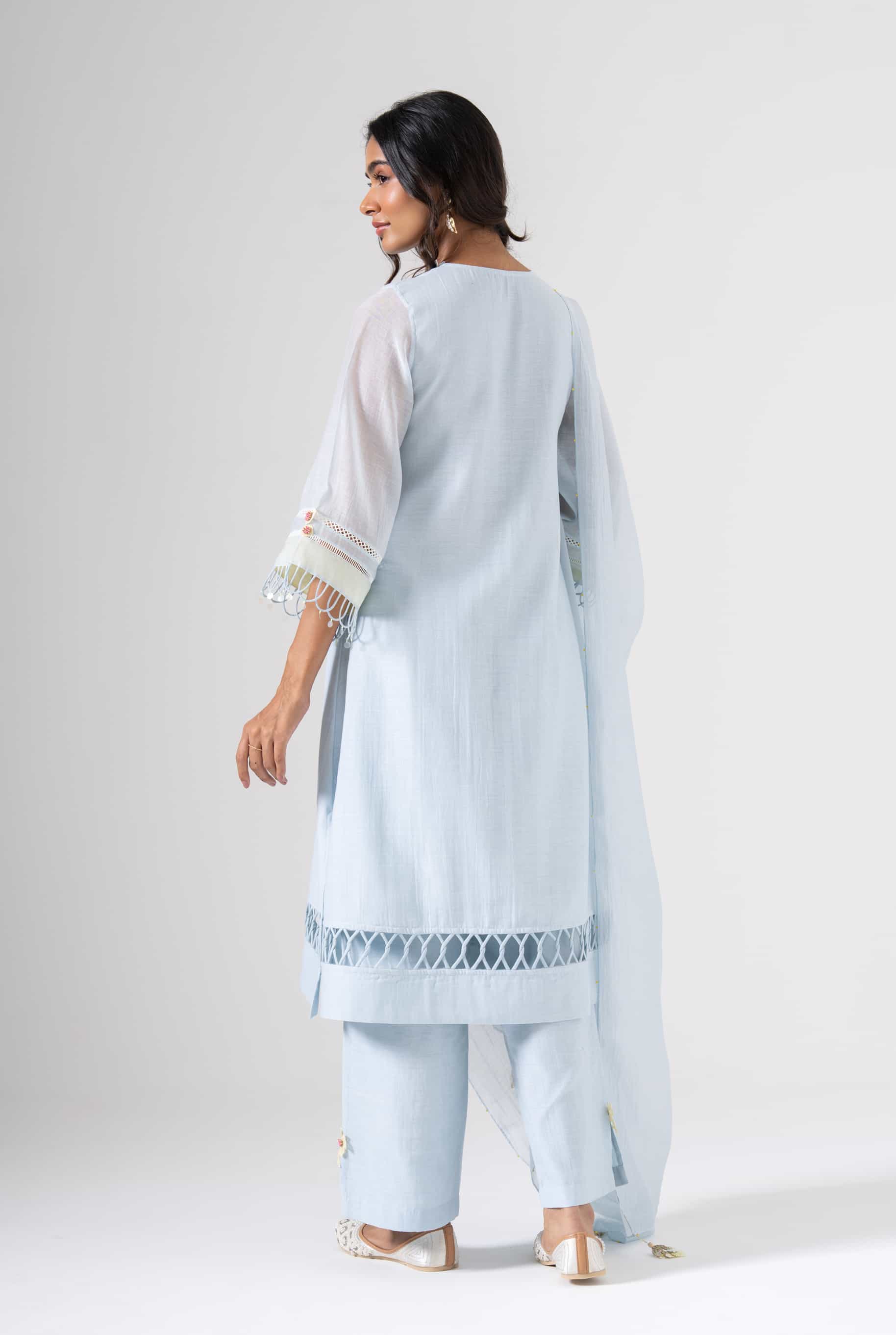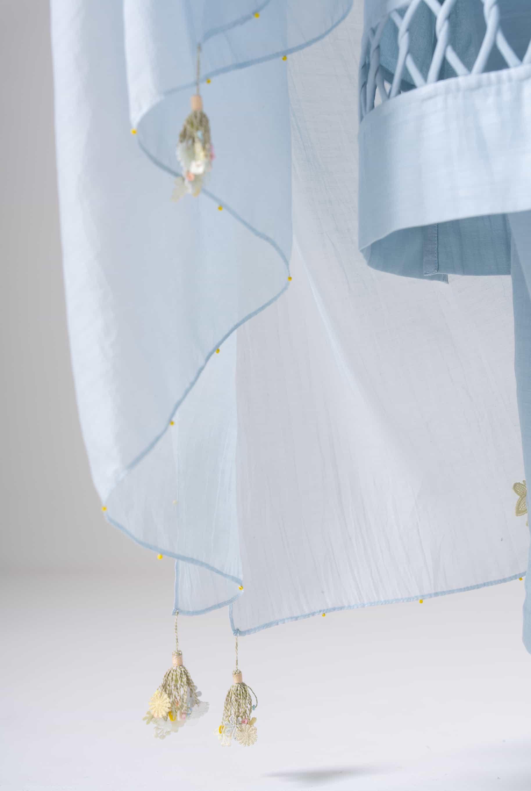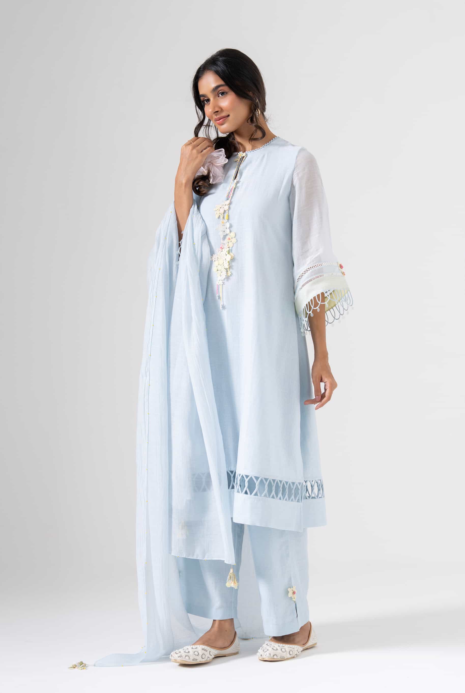 A light blue kurta set that blends delicate craftsmanship with everyday elegance. The kurta features soft floral patches and subtle detailing on the neckline and sleeves. Accents of pastel patches and intricate lacework add just the right amount of charm. This set is perfect for slow mornings, soft celebrations, or serene getaways.