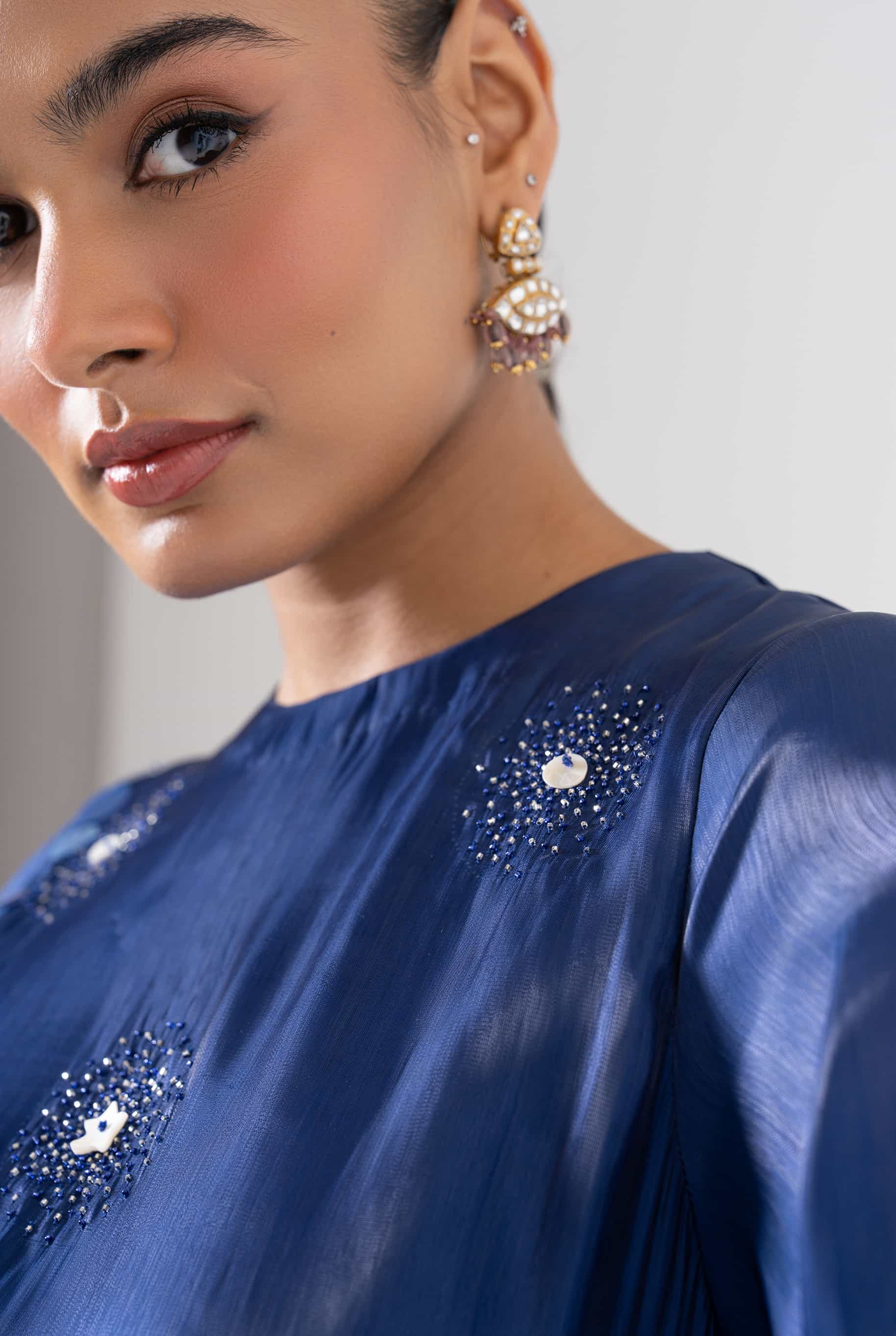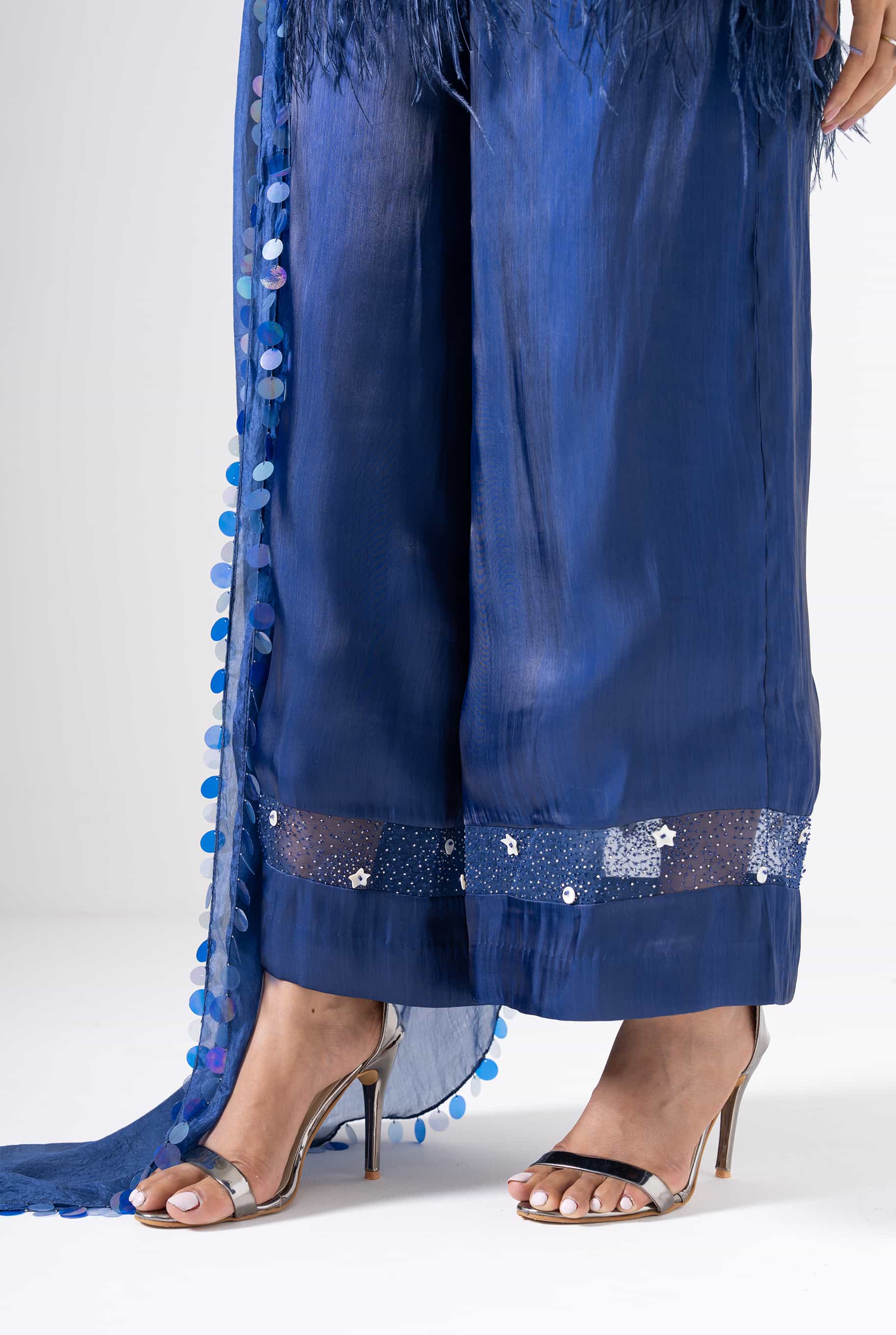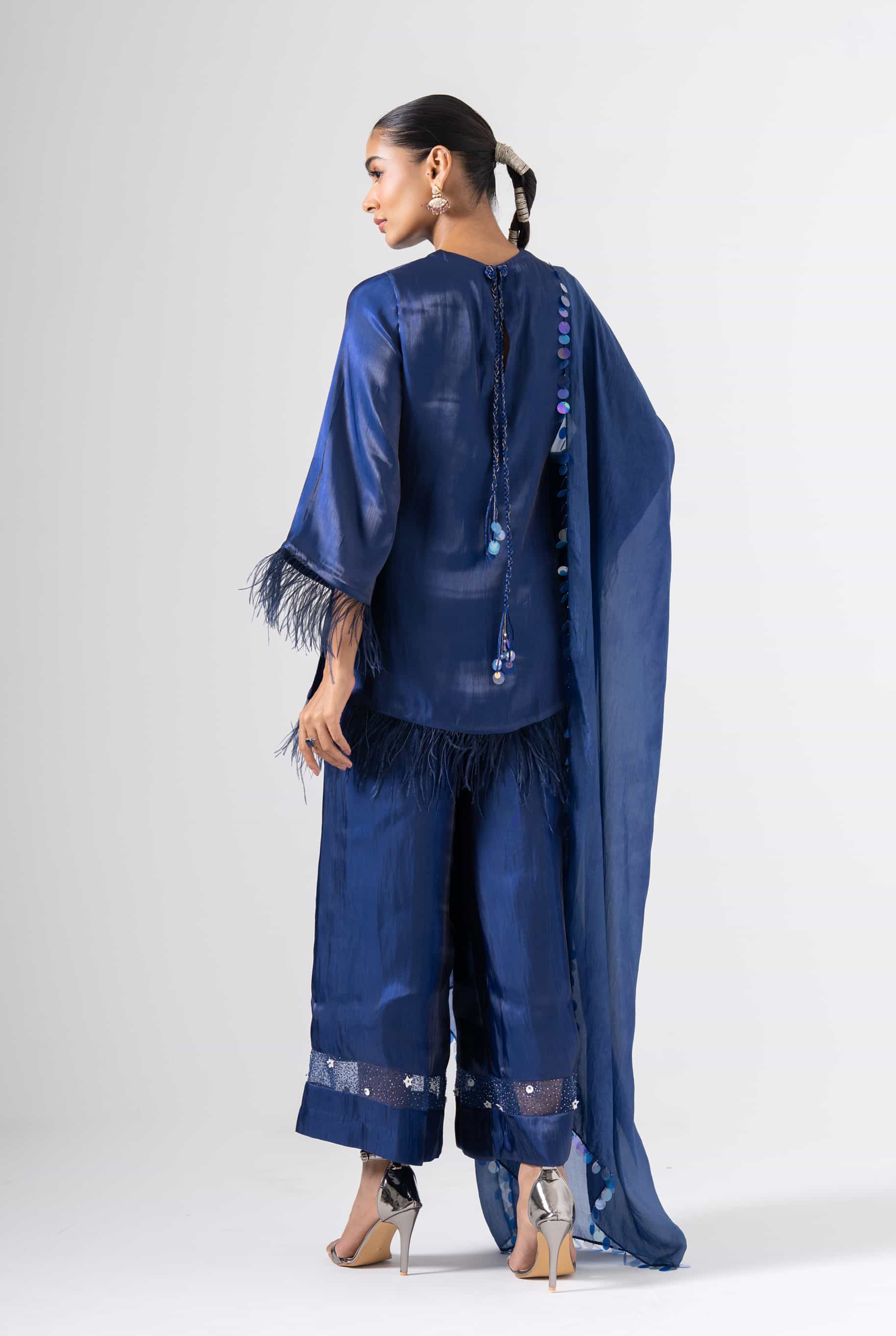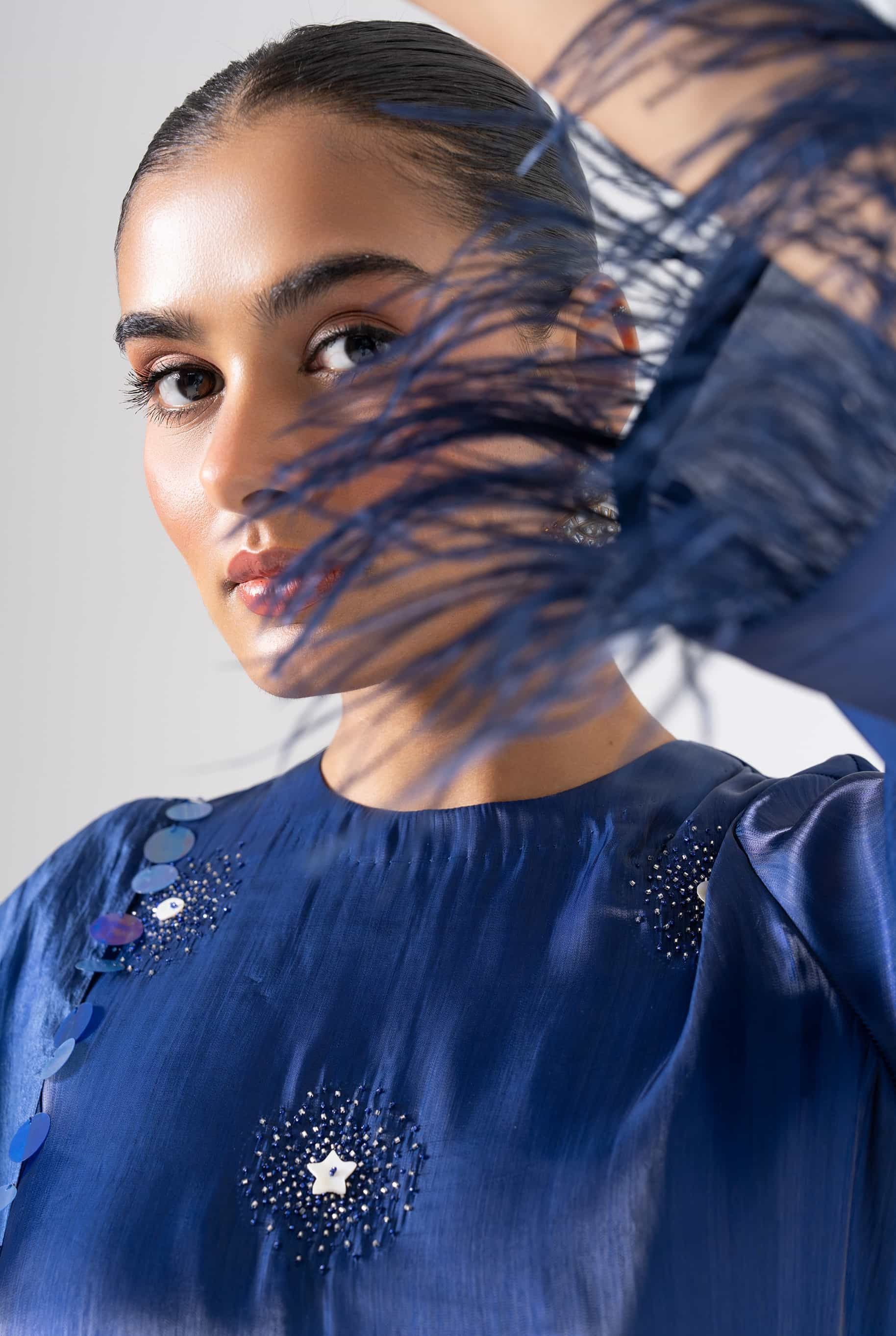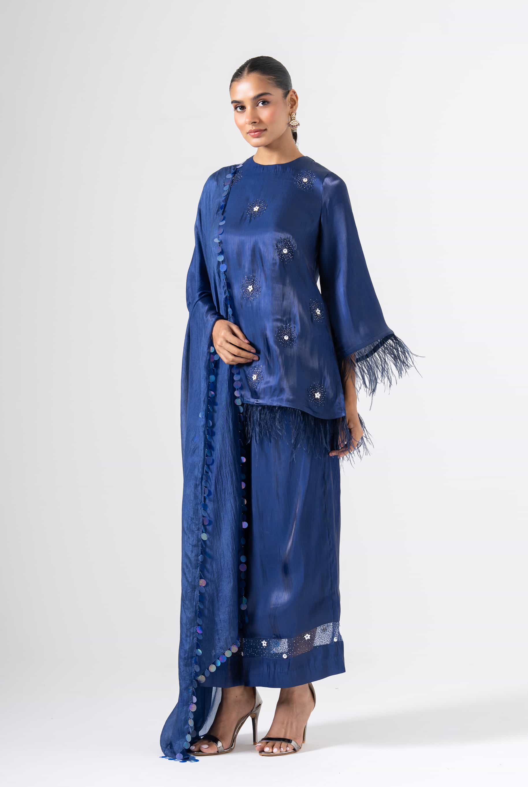 Crafted in a luxurious midnight blue, Starry Night is an elegant festive ensemble that draws inspiration from starlit evenings. The silk-finish kurta is delicately embellished with beads and soft feather detailing that adds movement and flair. Paired with sheer-panelled palazzos and a dupatta finished with sequin discs, this set blends classic richness with modern drama - making it ideal for evening celebrations, wedding soirées, and festive nights.
