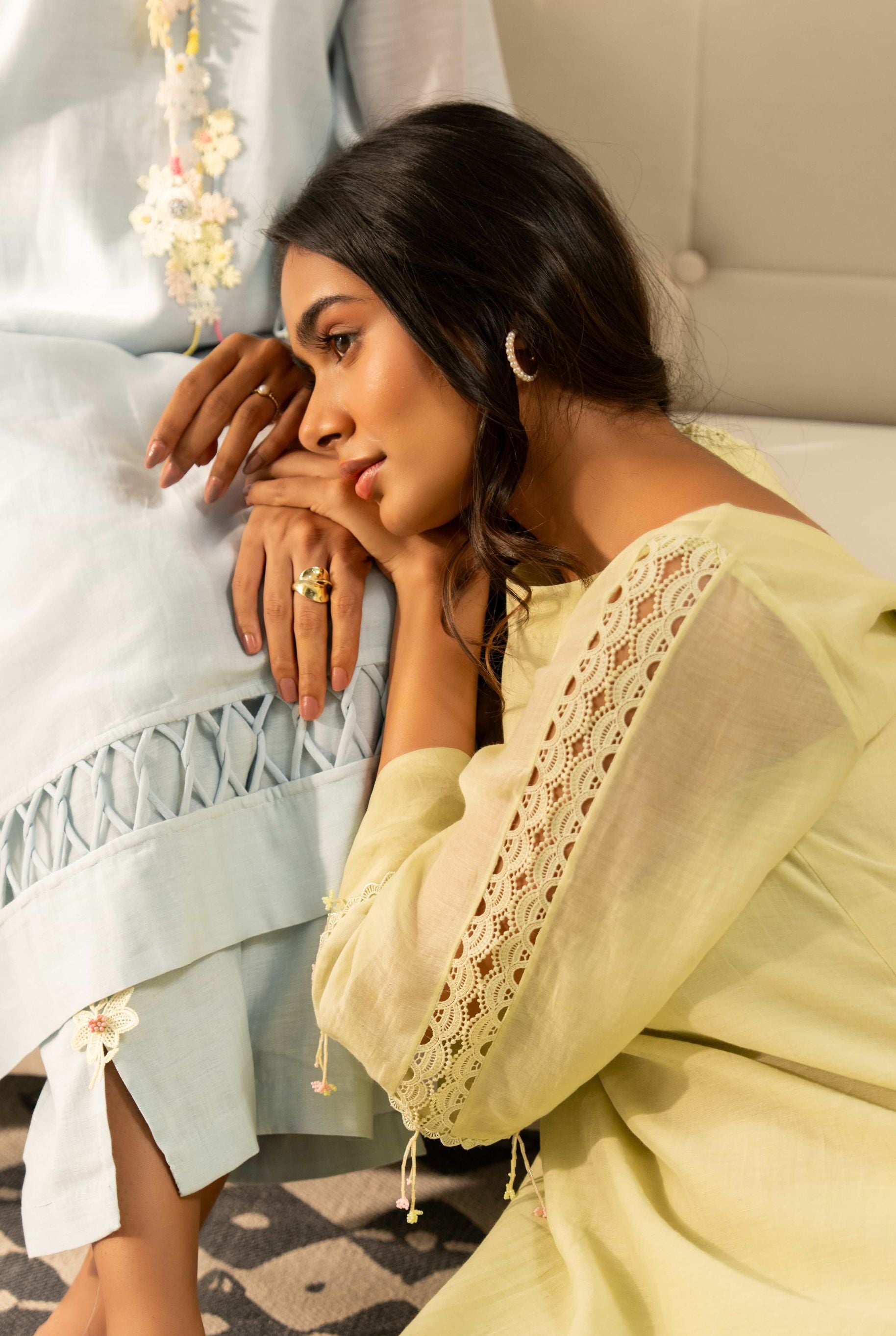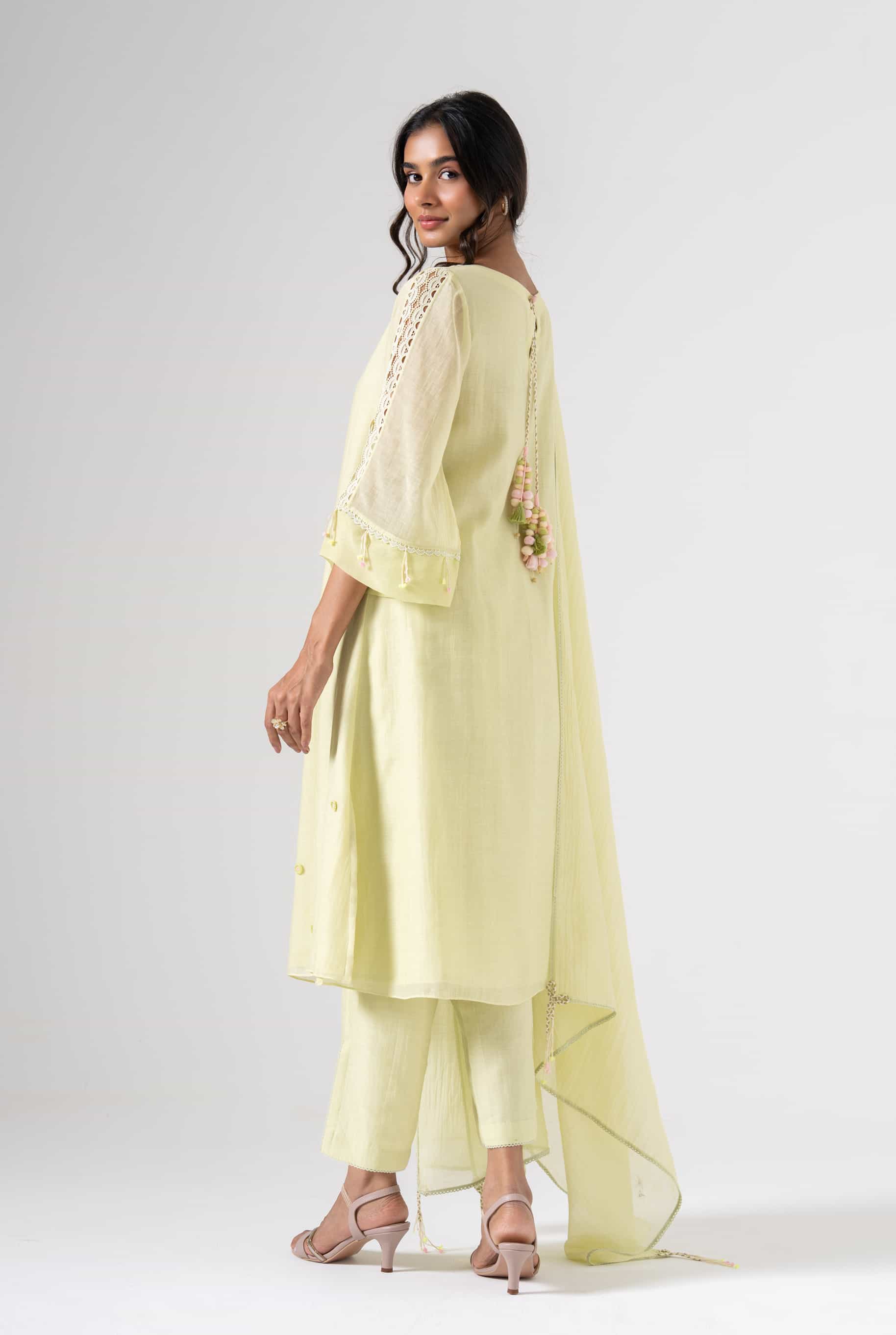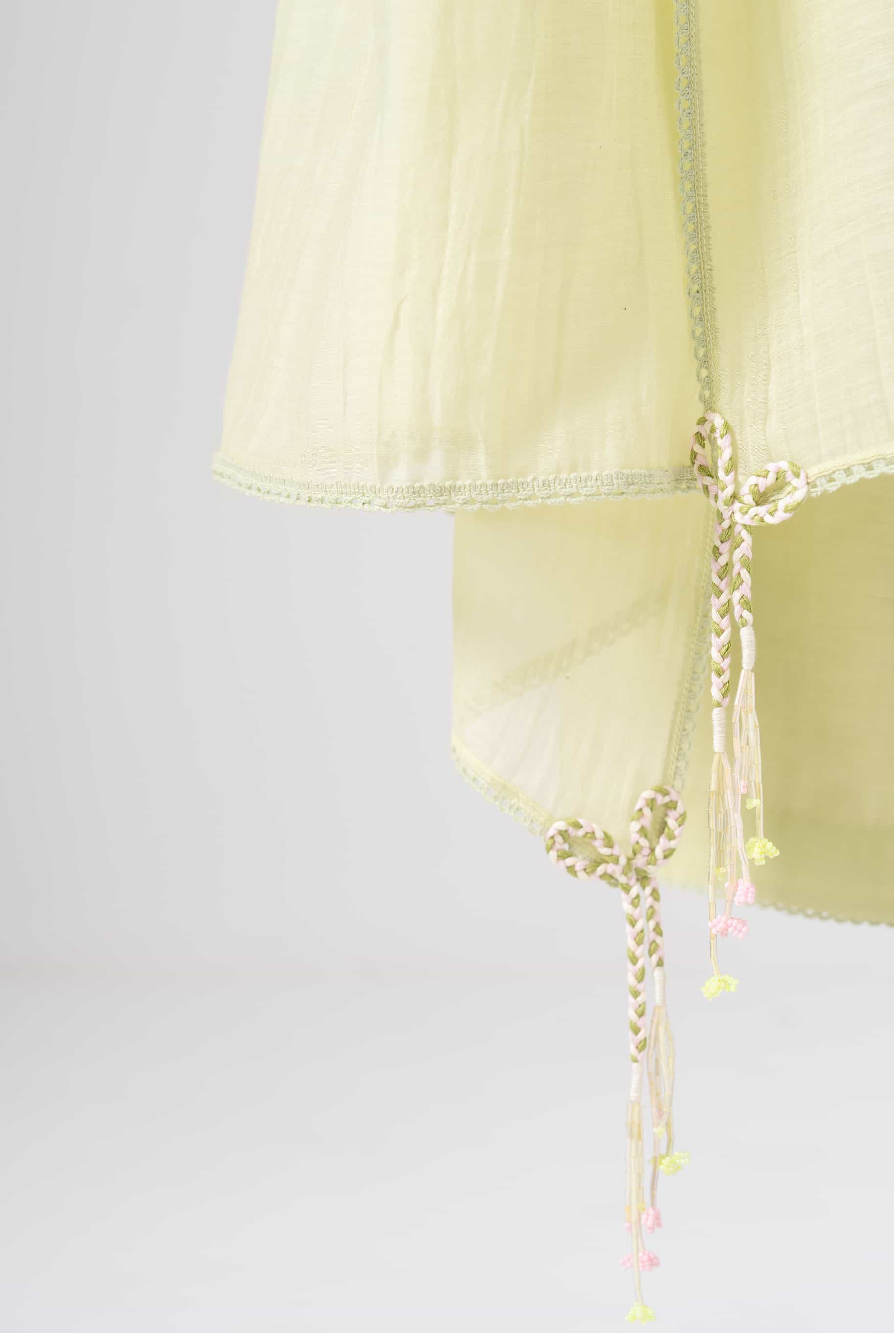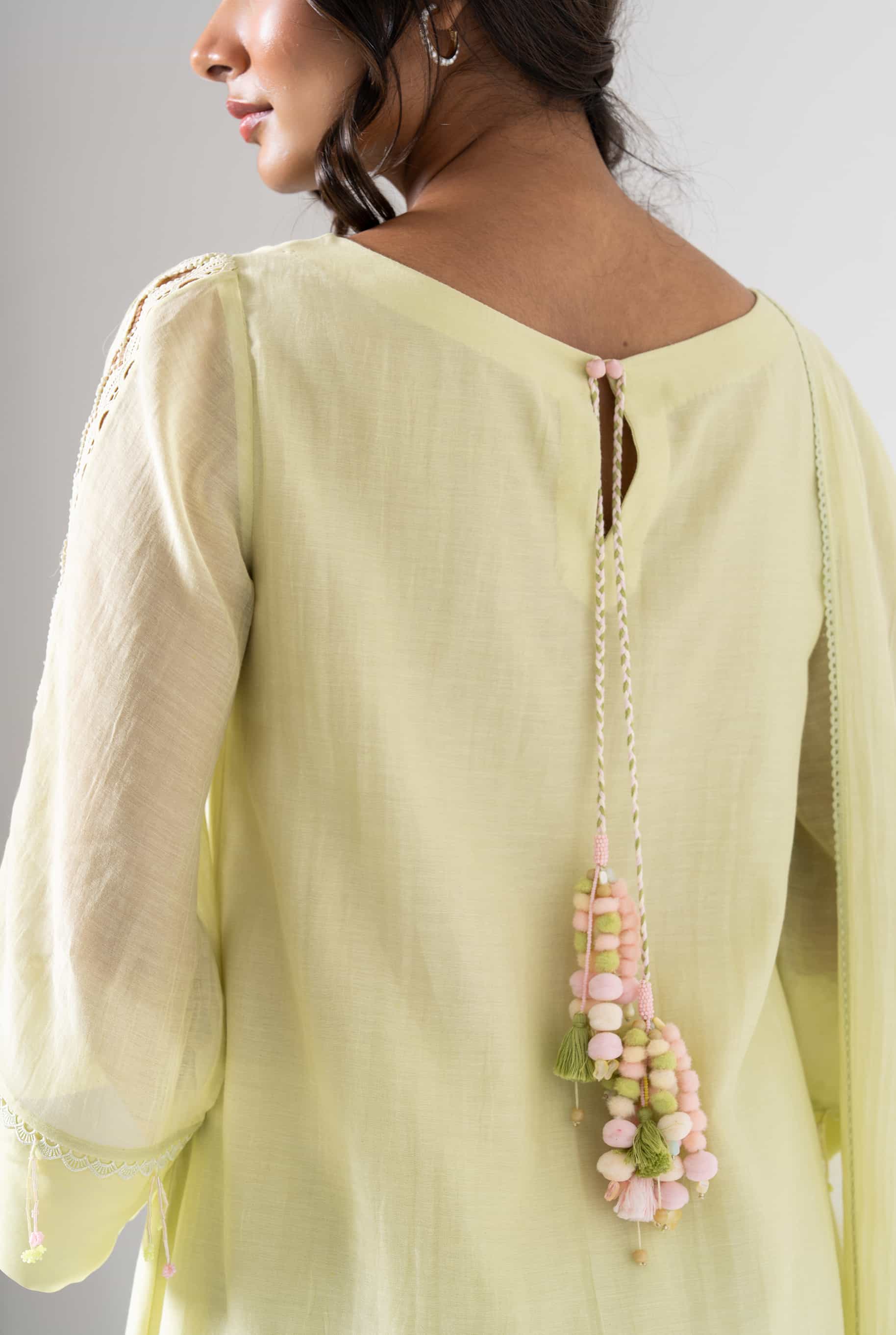 Fresh and uplifting, Morning Mist is a pista green kurta set that captures the essence of early daylight. Embellished with subtle pompoms and soft pastel bead tassels, the kurta radiates quiet elegance. Intricate lacework on the sleeves and dupatta edges adds refined detail without overwhelming the look. Designed for ease and lightness, this set is perfect for summer brunches, festive mornings, or easy celebrations.