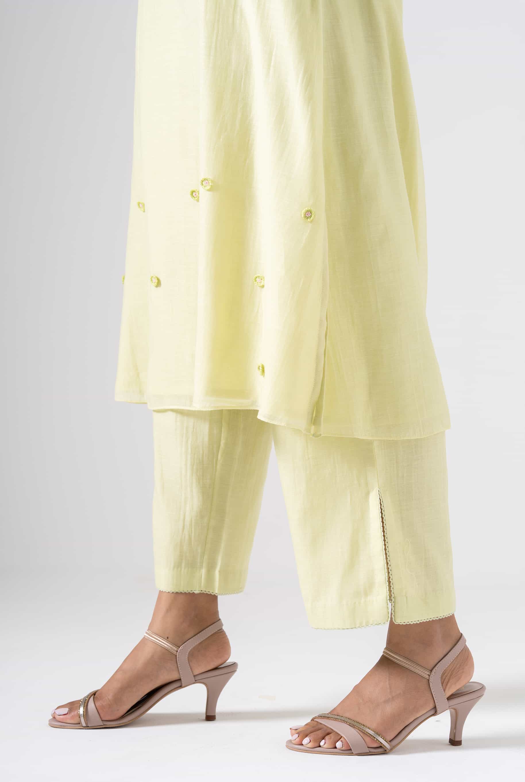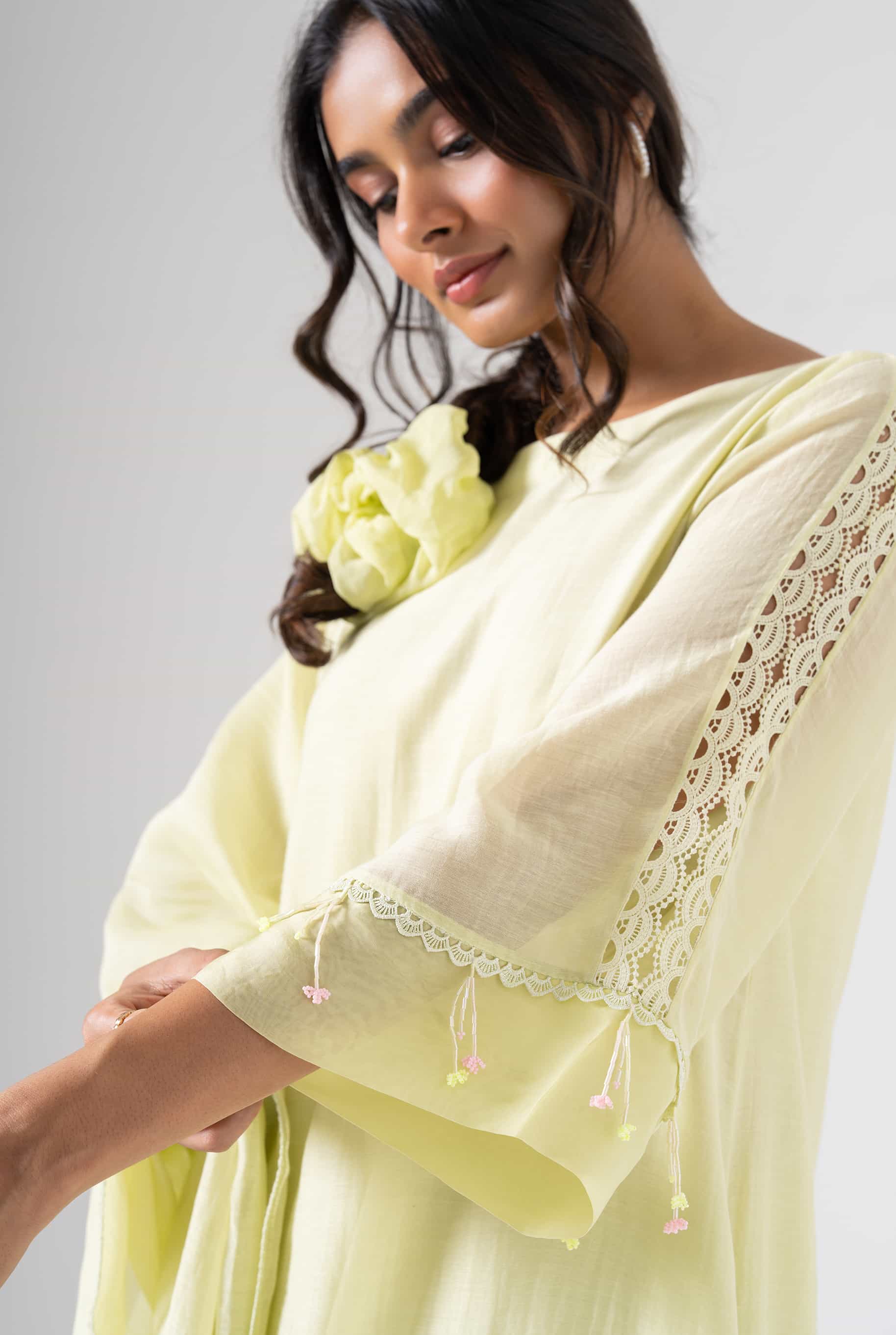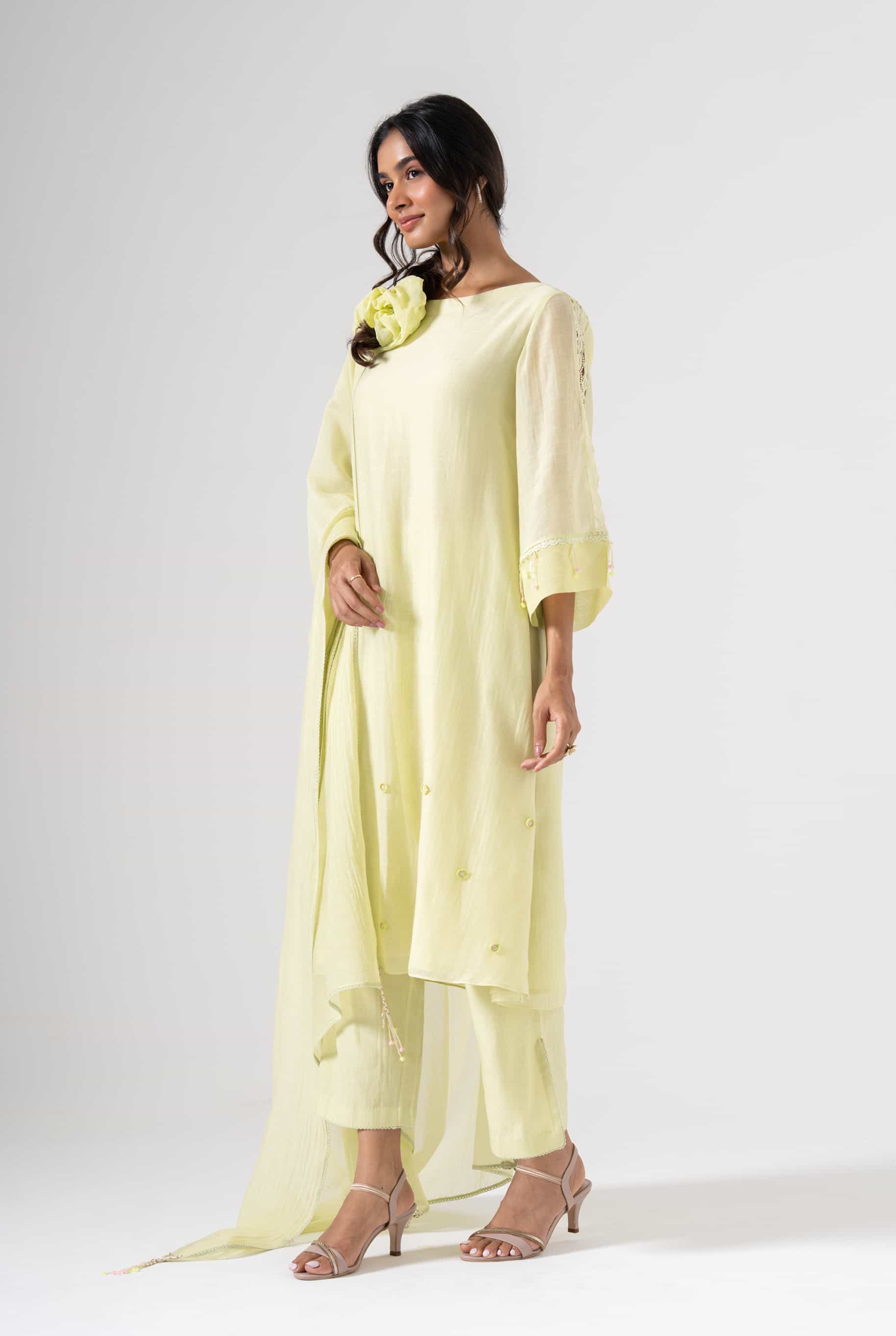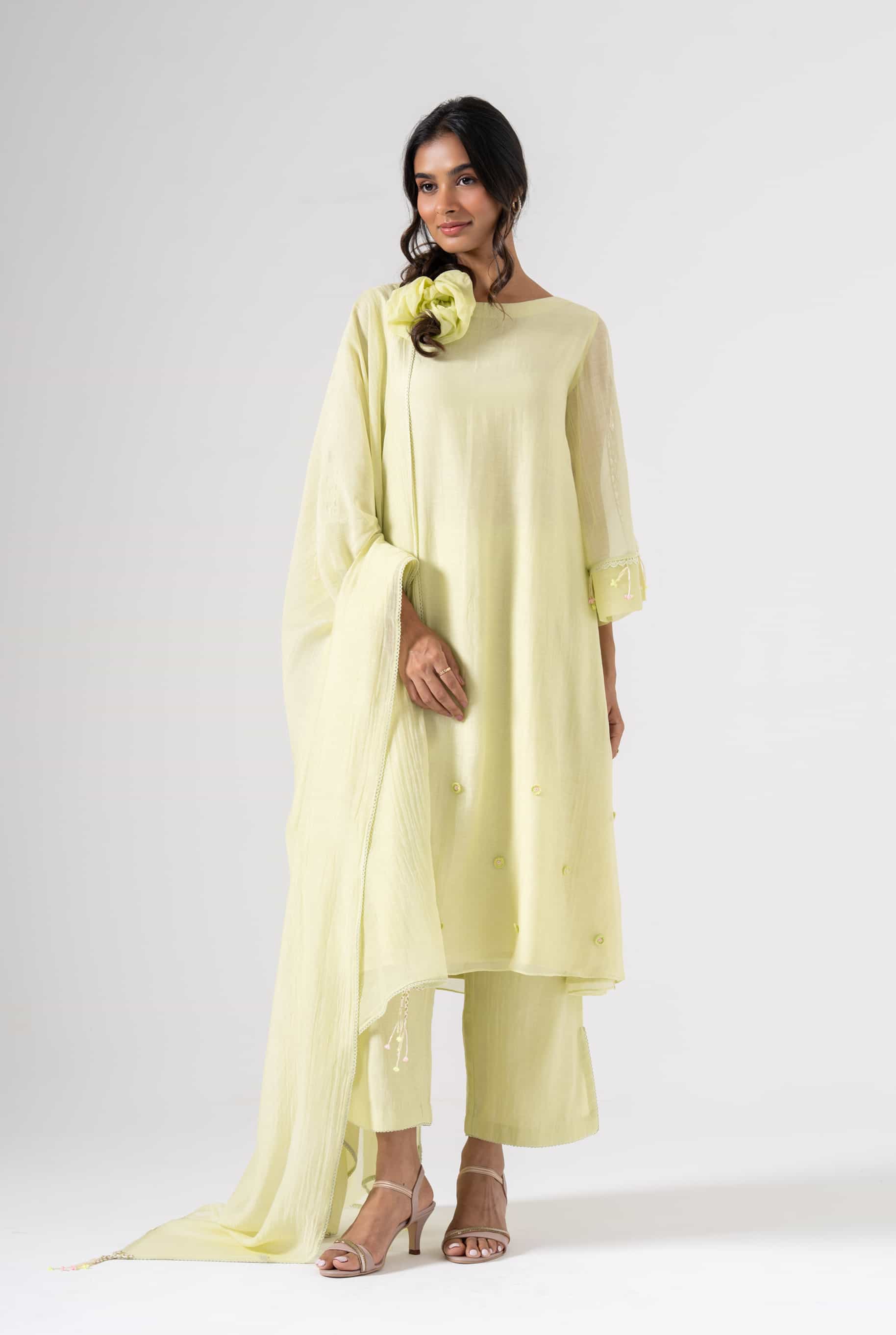 Fresh and uplifting, Morning Mist is a pista green kurta set that captures the essence of early daylight. Embellished with subtle pompoms and soft pastel bead tassels, the kurta radiates quiet elegance. Intricate lacework on the sleeves and dupatta edges adds refined detail without overwhelming the look. Designed for ease and lightness, this set is perfect for summer brunches, festive mornings, or easy celebrations.